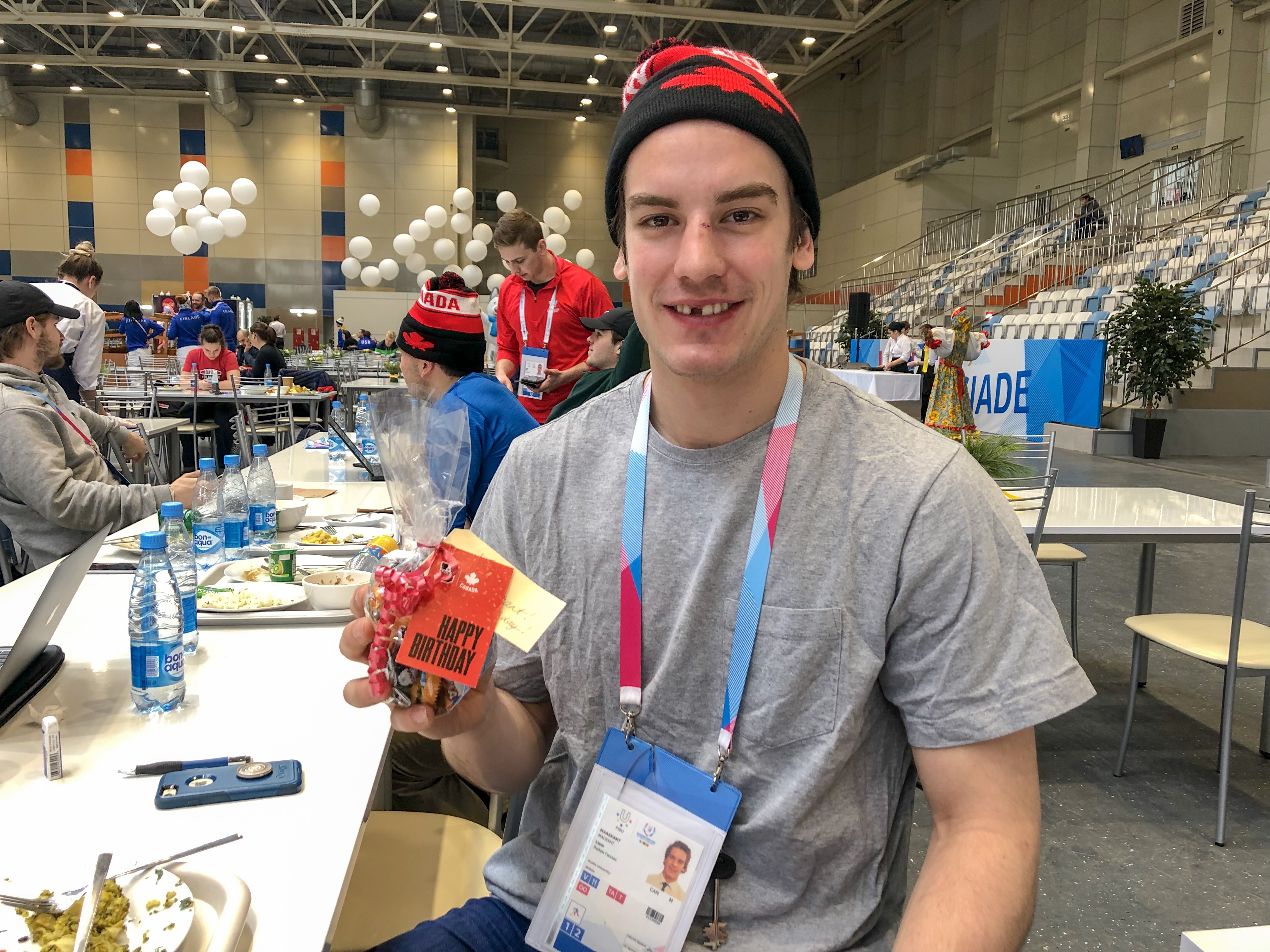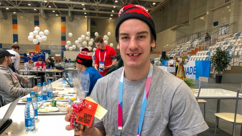 Пока общались с канадскими хоккеистами о сиропе, заметили их праздничное настроение. Оказывается, у защитника команды Лиама Масканта день рождения! Да еще и юбилей – 25 лет! Рядом стоит коробка российских конфет, оказывается, спортсмена уже поздравили внимательные волонтеры, работающие на информационной стойке дома, где живет канадская сборная. Мы тоже поздравили Лиама, но победы желать не стали. Потому что уже завтра, 11 марта, сборная Канады проведет свой полуфинальный матч против сборной России.