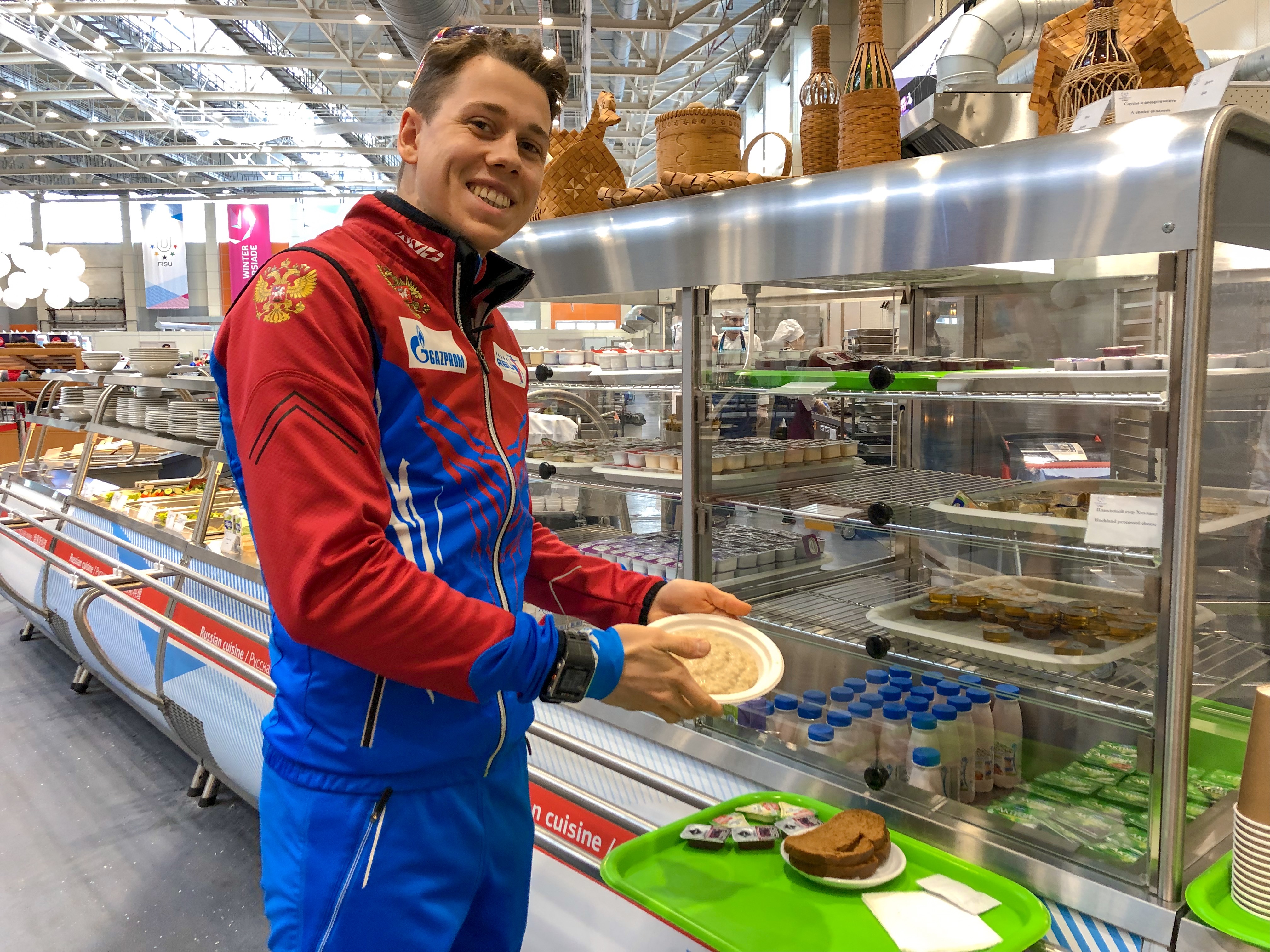 А есть те, кто выбирает секцию с раздачей исходя из ее расположения. Так, секция с халяльной кухней самая первая, а, чтобы дойти до блюд европейской кухни, которая находится в самом конце линии, придётся пройти около 100 метров. И пока определишься с выбором, возьмешь блюда, которые хочешь попробовать, успеешь потратить калории и самое главное, время. Василию Томшину – российскому биатлонисту, сегодня утром не захотелось идти далеко, он завтракает блюдами халяльной кухни.