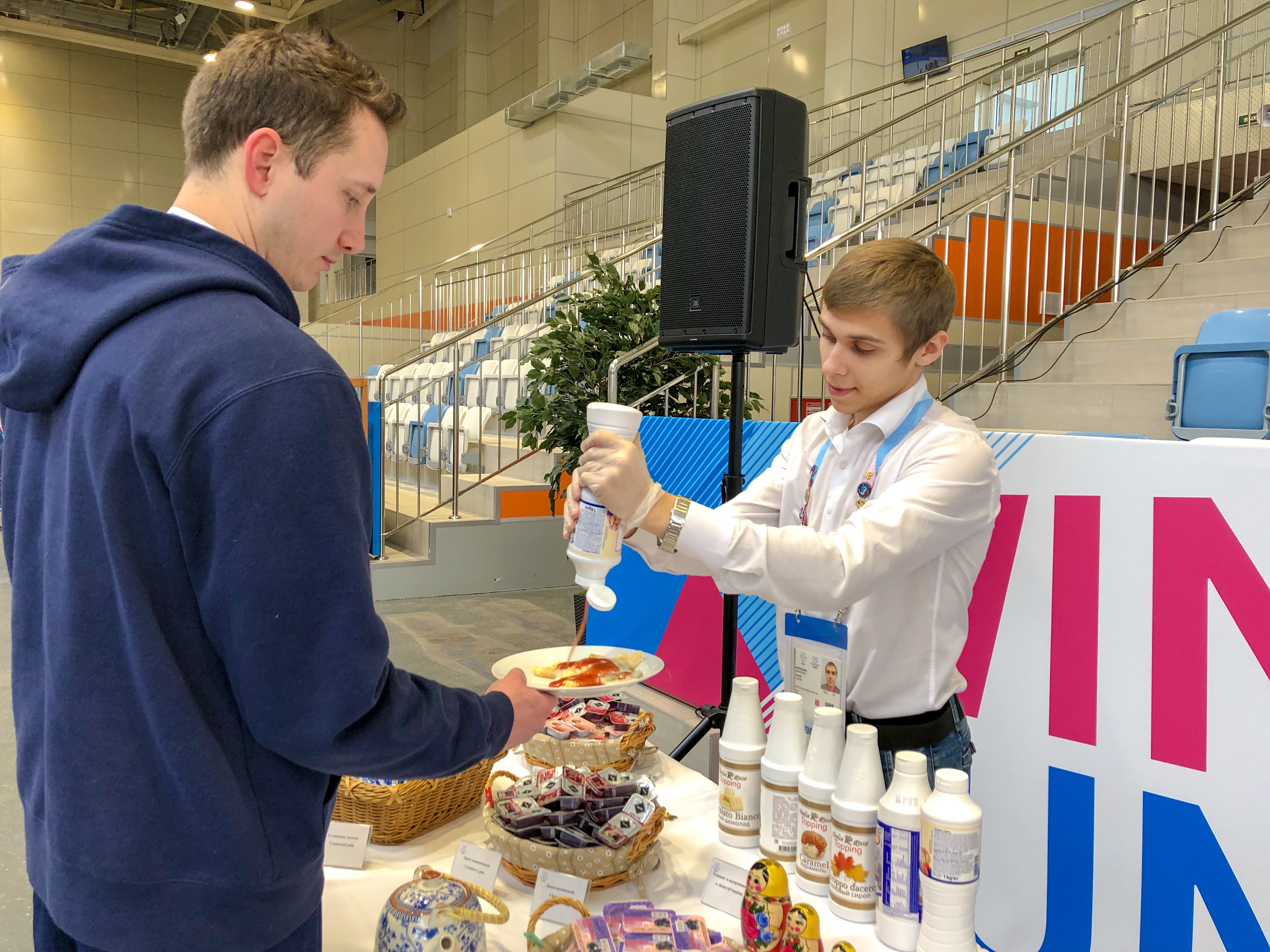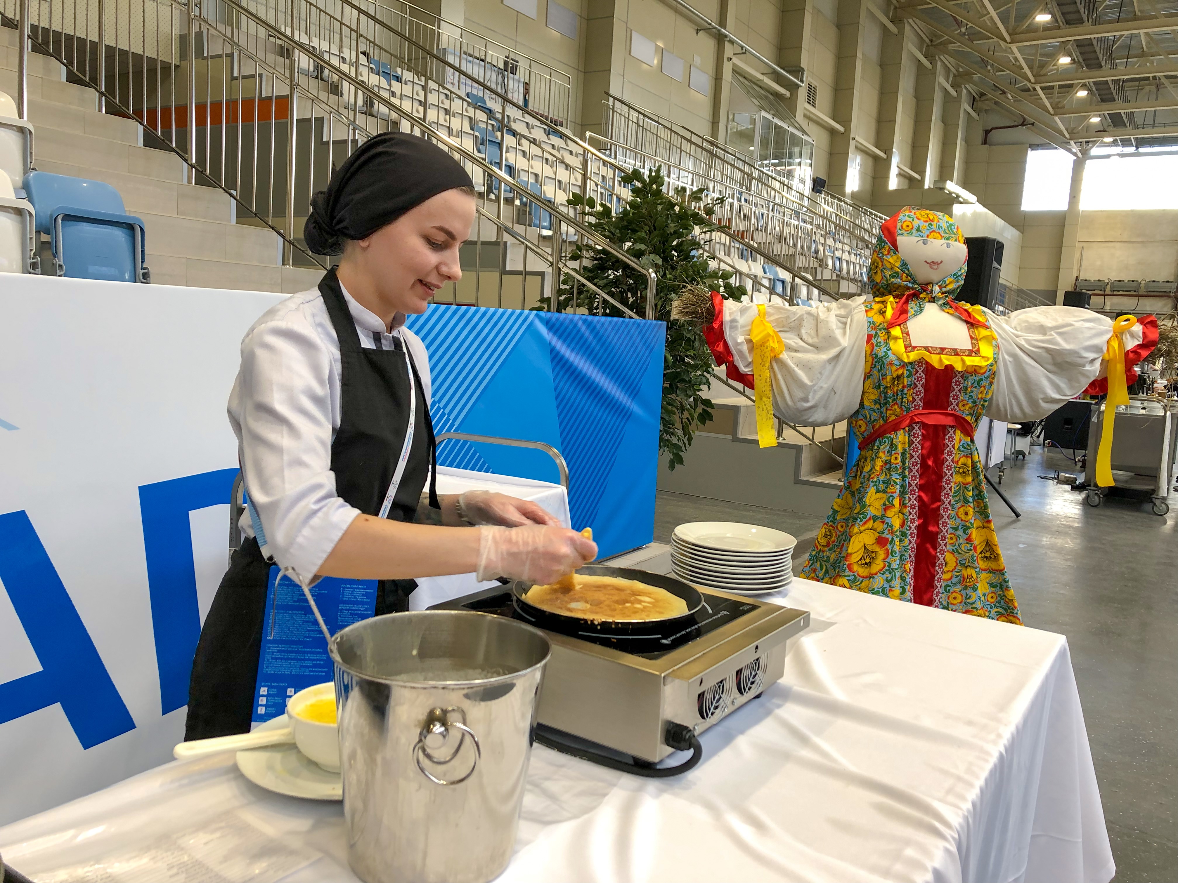 Надо отметить, что в момент проведения Универсиады проходит традиционная для России масленичная неделя - то время, когда каждый день надо печь и есть блины. И знаете, нам кажется, что скоро Масленицу будут отмечать по всему миру, потому что иностранцы просто в восторге от этой традиции. Сразу скажем, что логистика в ресторане отлажена идеально и очередей на раздаче нет совсем. Единственное место, где придется немного постоять и подождать – два отдельных стола с блинницами. Сотрудники ресторана пекут блины не останавливаясь, но они разлетаются мгновенно. «Меньше двух блинов никто не берет, а многие еще и ходят за добавками», рассказывает девушка Настя, которая добавляет в блины сиропы (у работников блинниц есть разделения на тех, кто блины печет и тех, кто добавляет к ним соусы, джемы и другие добавки), - из всех представленных добавок иностранцы предпочитают сгущенку и мед», - продолжает Настя. Надо сказать, что гостей также очень привлекают традиции Масленицы. Хоккеист сборной Словакии узнает от нас о главном обряде - сжигании чучела и сразу предлагает сидящему рядом другу изменить планы на день и посетить фан-парк, где сегодня как раз пройдут масленичные гулянья.