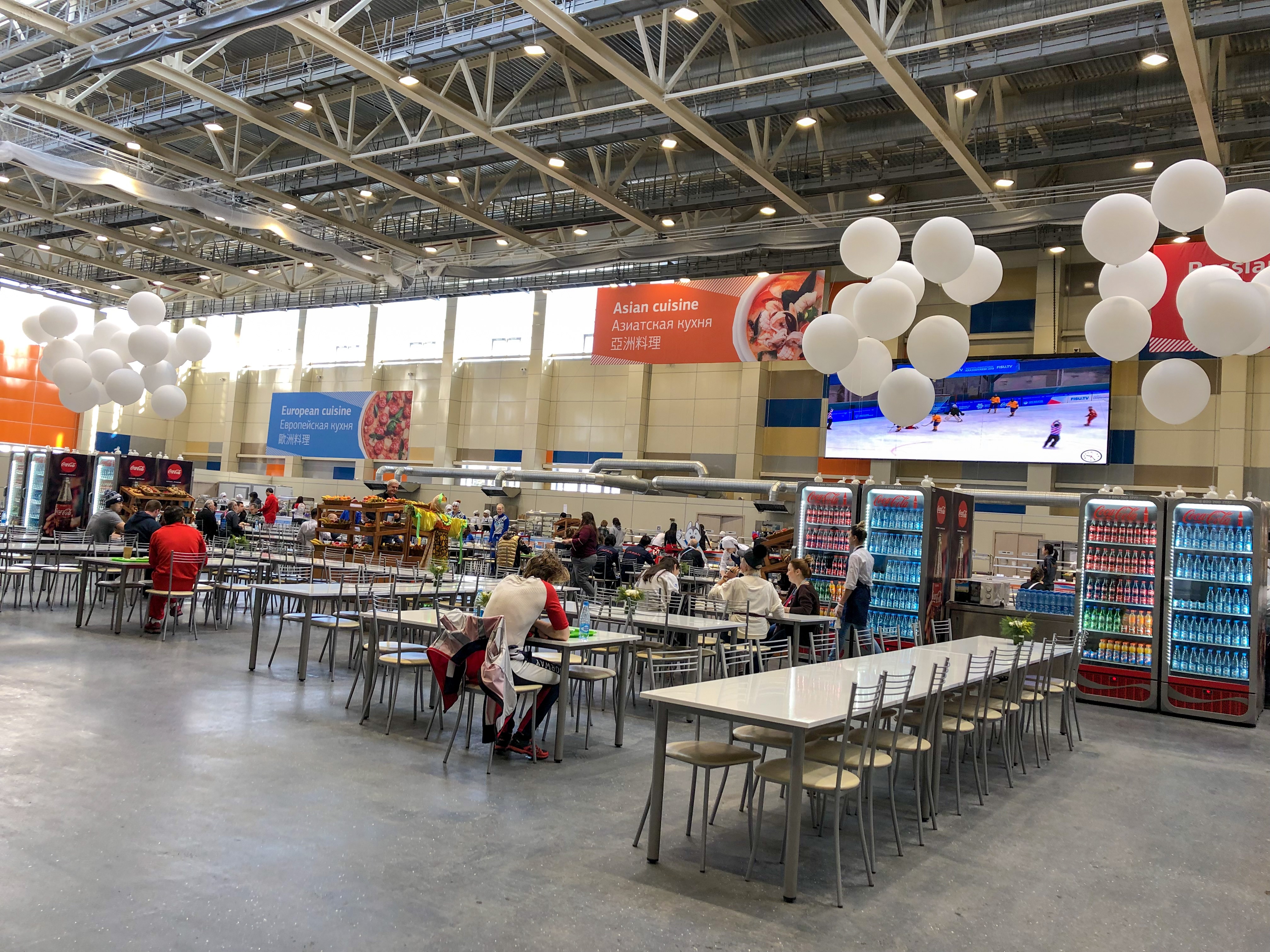 Ресторан Деревни Универсиады. Здесь играет живая музыка, на экранах крутят видео с лучшими моментами прошедших стартов, периодически объявляют итоги соревнований, а по утрам поздравляют именинников. Здесь можно ненадолго отвлечься от соревновательного ритма, насладиться гастрономическими изысками и даже завести новые знакомства. Факт, что это место является самым популярным и излюбленным у спортсменов и членов делегаций. Двери ресторана открыты с 5 утра и до часа ночи. Организаторы предлагают отведать блюда следующих кухонь: русской, азиатской, европейской и халяльной.