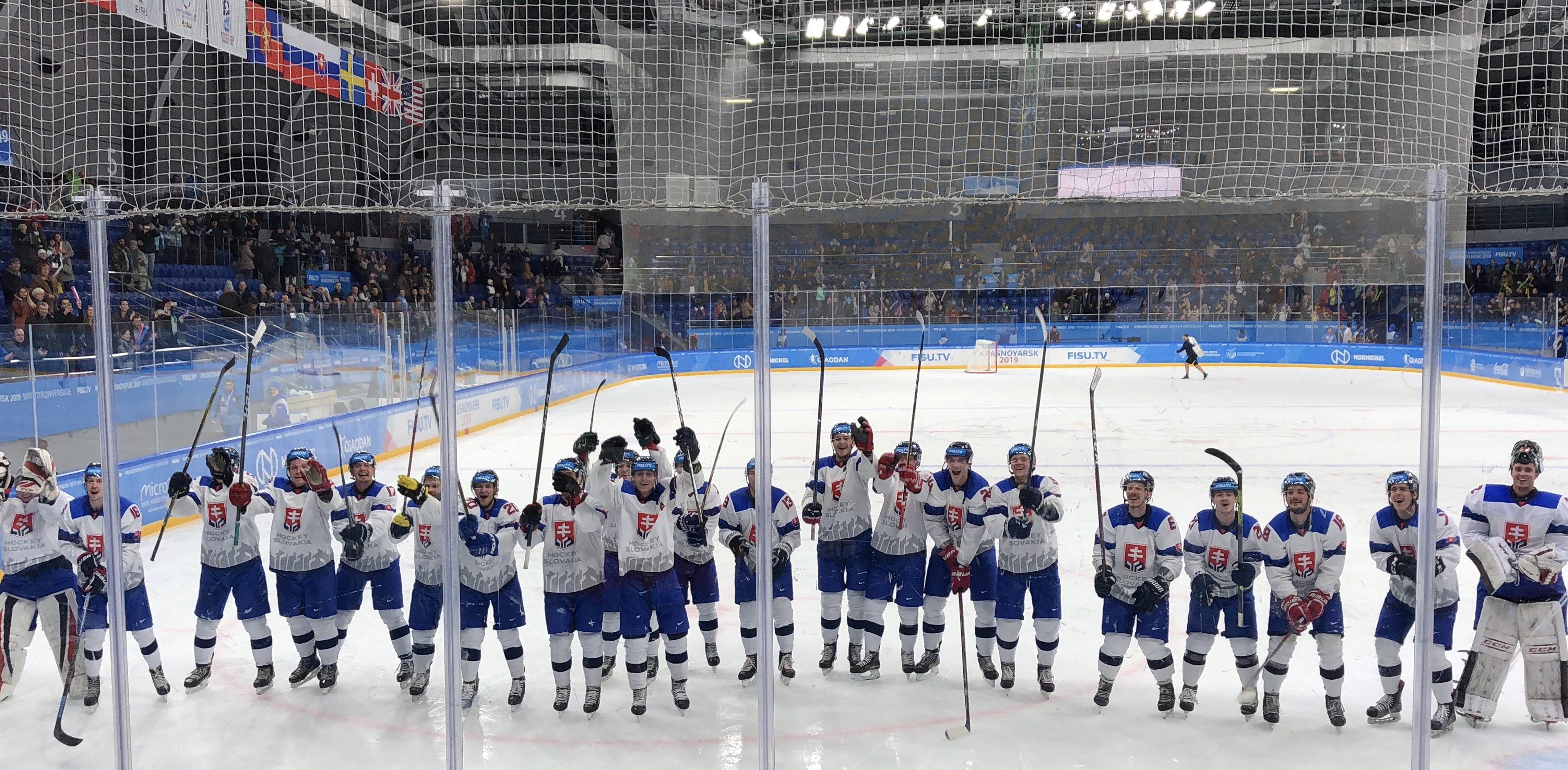 Сразу после завершения пресс-подхода, когда мы уже планировали возвращаться в Деревню Универсиады, с нами связался Адам (тот самый, хоккеист сборной Словакии, о котором мы рассказывали в нашем первом репортаже) и предложил нам прийти на трибуны, поддержать его команду, которой предстояло провести полуфинальный матч против сборной Казахстана. Мы сказали, что с удовольствием бы посетили матч, но у нас нет билетов. Адам быстро решил этот вопрос через менеджера своей сборной и достал нам билеты.