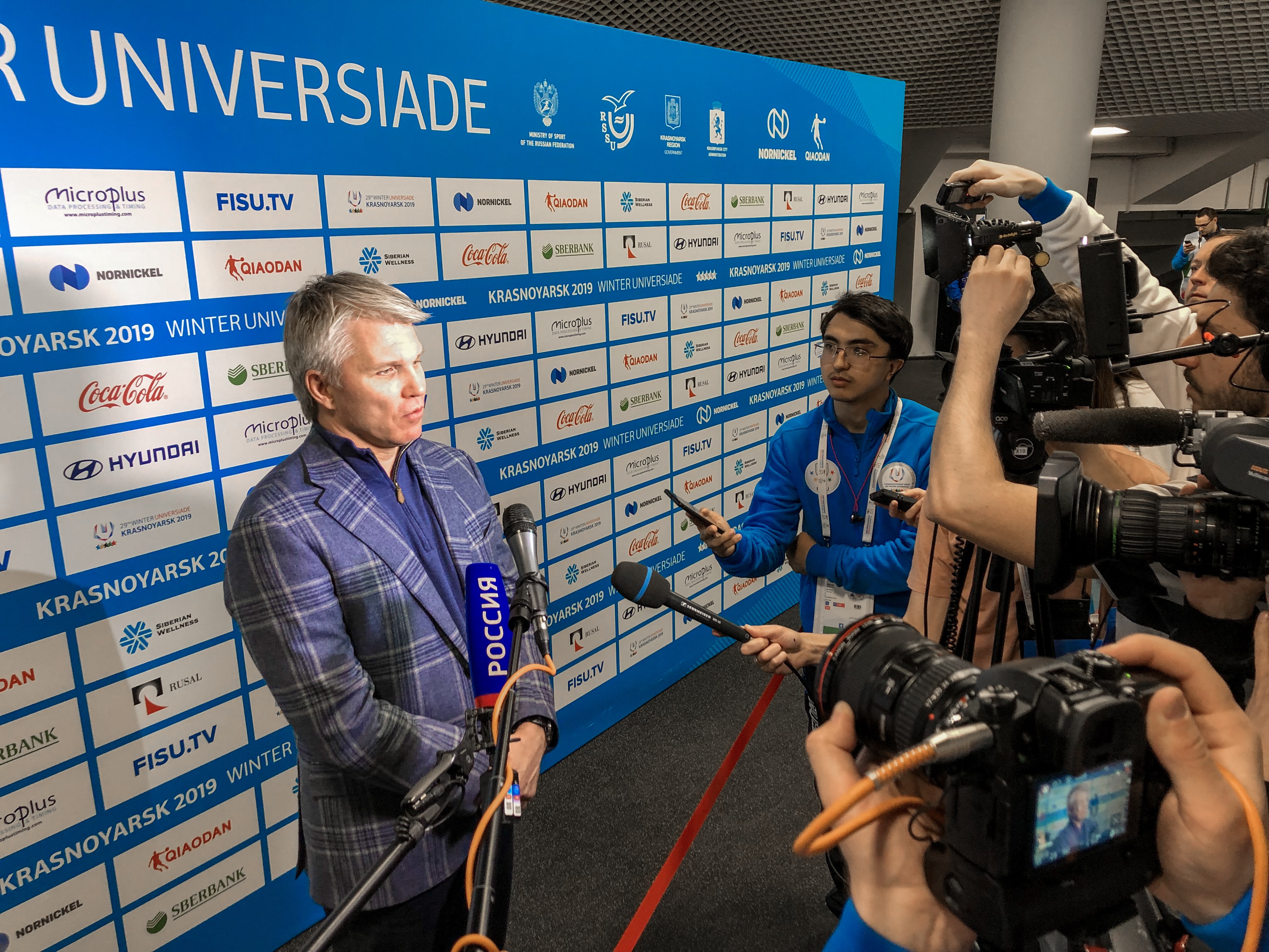На пресс-подходе министр подвел предварительные итоги зимней Универсиады: «Накануне прошло совещание с руководителями делегаций, которые высоко оценили организацию соревнований, судейство. Приятно, что соревнования вызвали интерес у зрителей. Мы поставили рекорд, впервые проданы все билеты, трибуны заполнены».