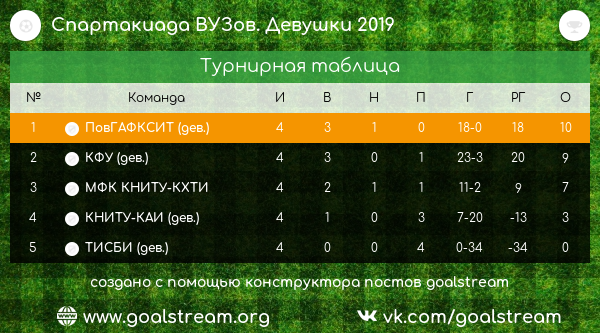 Обладательницами золотых медалей стали студентки Поволжской академии спорта. Девушки провели 4 матча, на их счету 3 победы и одна ничья в заключительно матче против сборной КНИТУ (0:0).