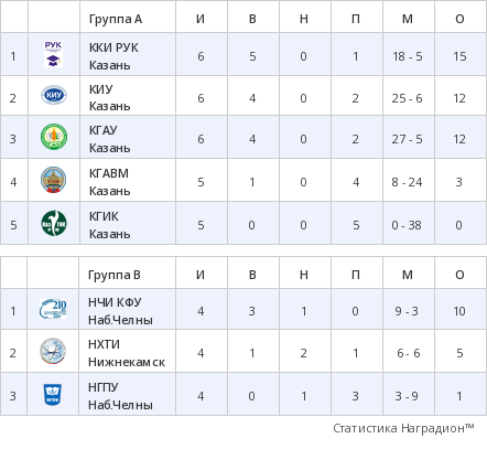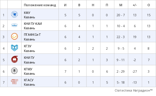 На данный момент в активе команды КФУ 5 матчей, к слову, это наименьший показатель среди всех команд, но все свои матчи команда смогла довести до победы, набрать 15 очков и возглавить турнирную таблицу! Вторую и третью строчку, набрав по 13 очков, делят команды КНИТУ-КАИ и Поволжской академии спорта. Обе сборные провели по 6 матчей, из которых в 4 смогли добиться победы, один матч сыграли вничью, а также имеют одно поражение.