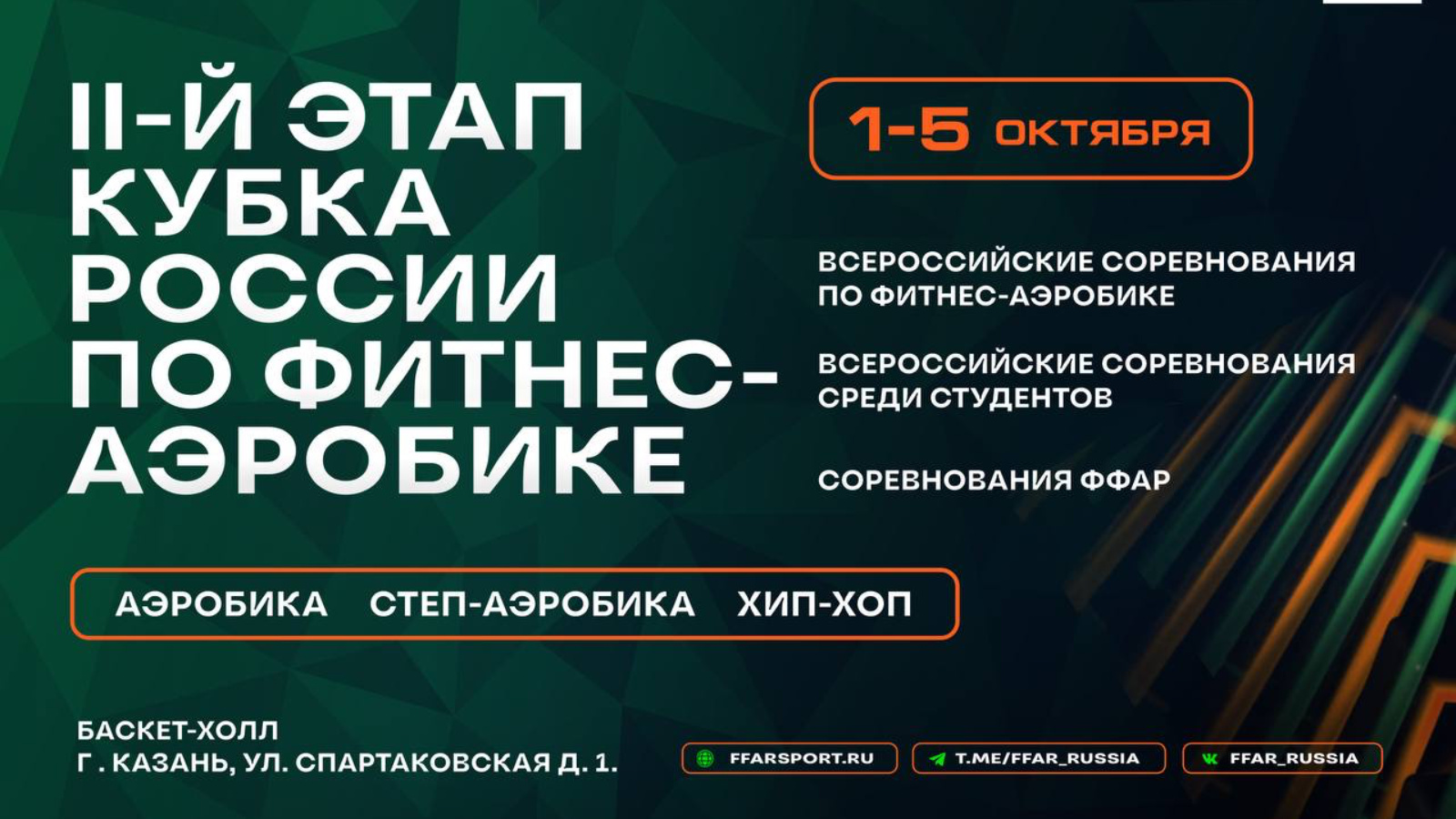 В 2011 году Казань впервые принимала состязания по фитнес-аэробике, сегодня ежегодный турнир выходит на новый уровень и открывается для зрителей. На спортивной арене «БАСКЕТ-ХОЛЛ» можно будет увидеть выступления профессионалов во втором отборочном этапе Кубка России, поддержать участников всероссийских соревнований среди начинающих спортсменов и студентов.