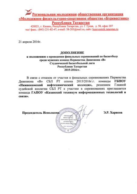 Решением Главной судейской коллегии к участию в финальных соревнованиях Первенства Дивизиона «В» СБЛ РТ 2015/2016 допускаются мужские баскетбольные команды следующих образовательных организаций Республики Татарстан: